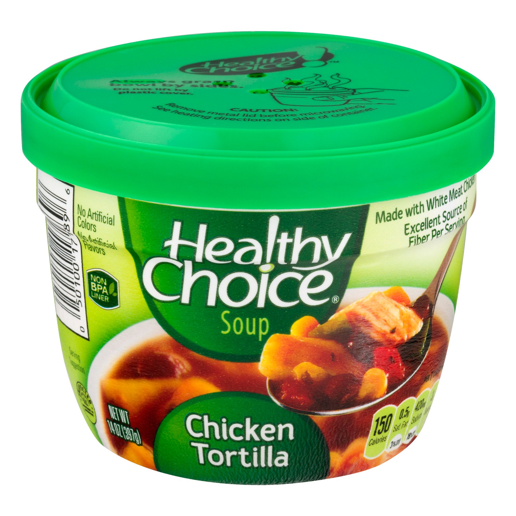 This microwaveable soup has 90 calories, 0 grams trans fat and 7 grams of protein per serving.