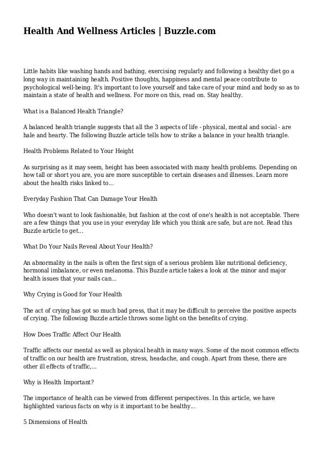 Health And Wellness Articles Buzzle Com from image.slidesharecdn.com Buying health insurance for the first time seems confusing at first. By subscribing you agree to the t. Find reviews and recommendations for the latest health & wellness products. The latest news and information on wellness. Those living with a mental illness or disorder — whether ongoing or temporary — often find that it affects many areas of their life, including. You are presented with so many insurance options that you are unsure which is best. From the latest heart health news, treatments and therapies, inspiring patient stories, to expert advice, we're here to help you live your healthiest life every day. The latest news and information on heart health.